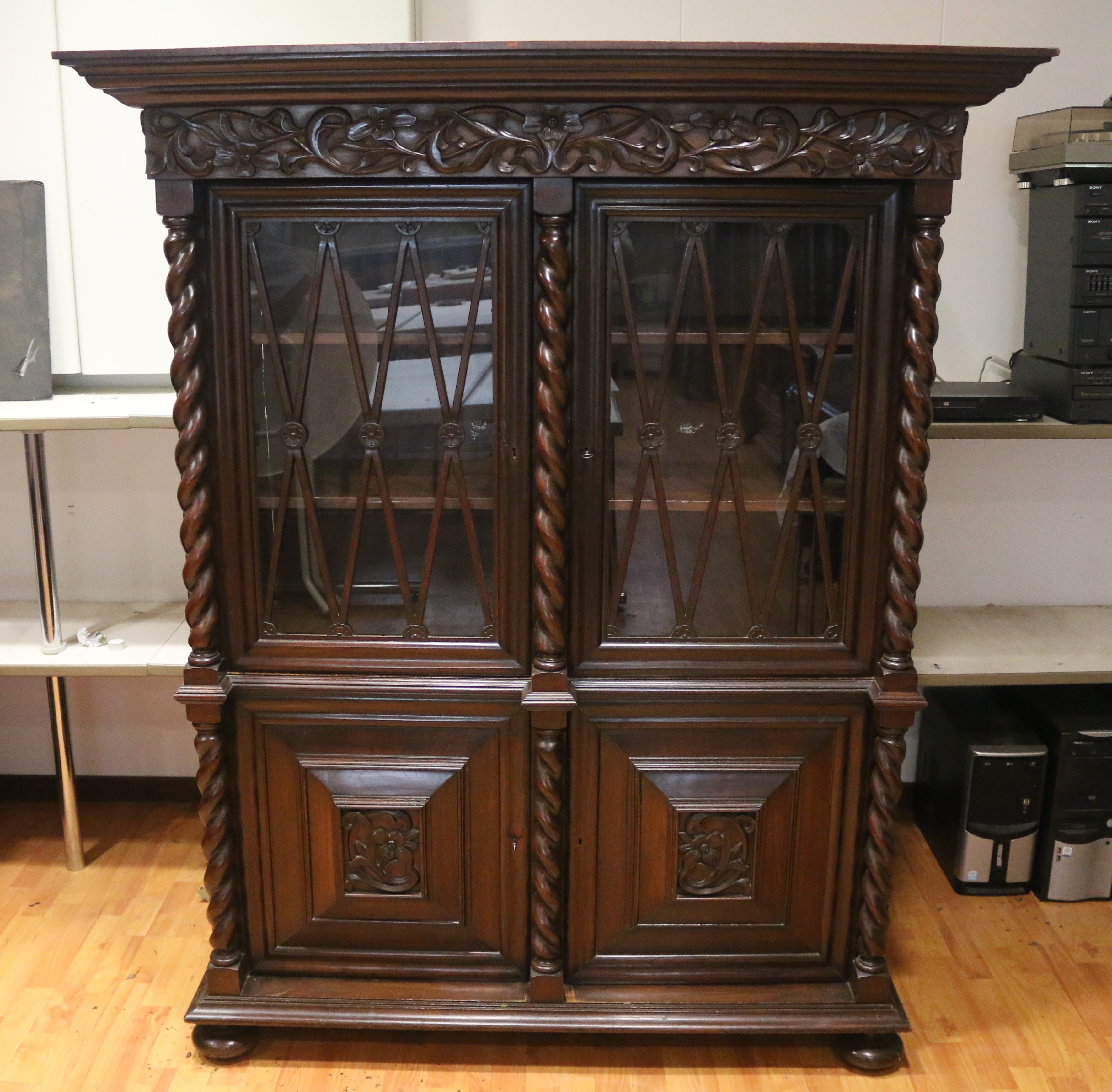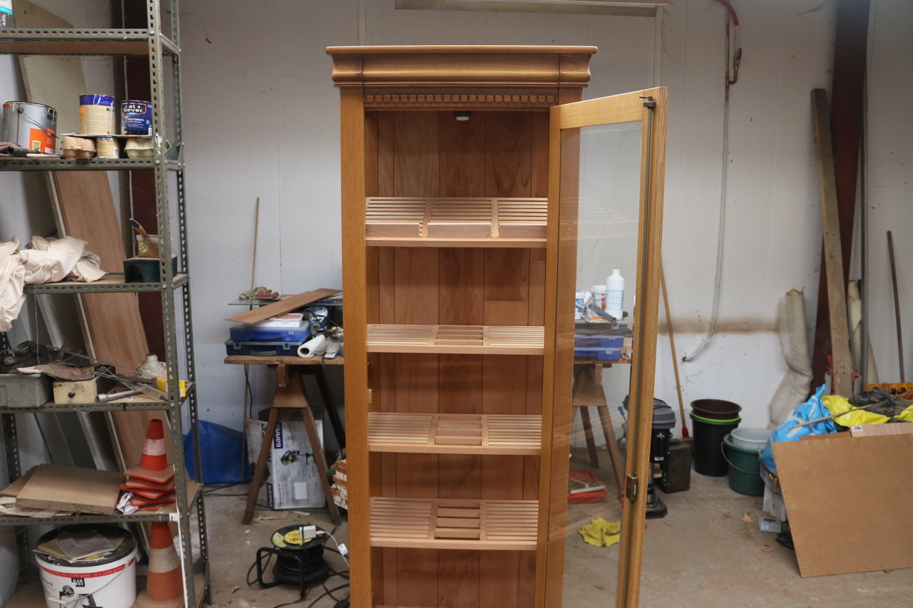Eerst wordt de kast op basis van uw wensen in orde gemaakt. Dat betekent waar nodig en gewenst gerestaureerd, geloogd, gezandstraald, geschuurd, geverfd, gebeitst, gevernist en/of geboend. Dan wordt het vitrinegedeelte aan de binnenzijde bekleed met Spaans cederhout en voorzien van speciaal op maat gemaakte cederhouten spijlenrekjes, waarna die ruimte voldoende luchtdicht wordt gemaakt.